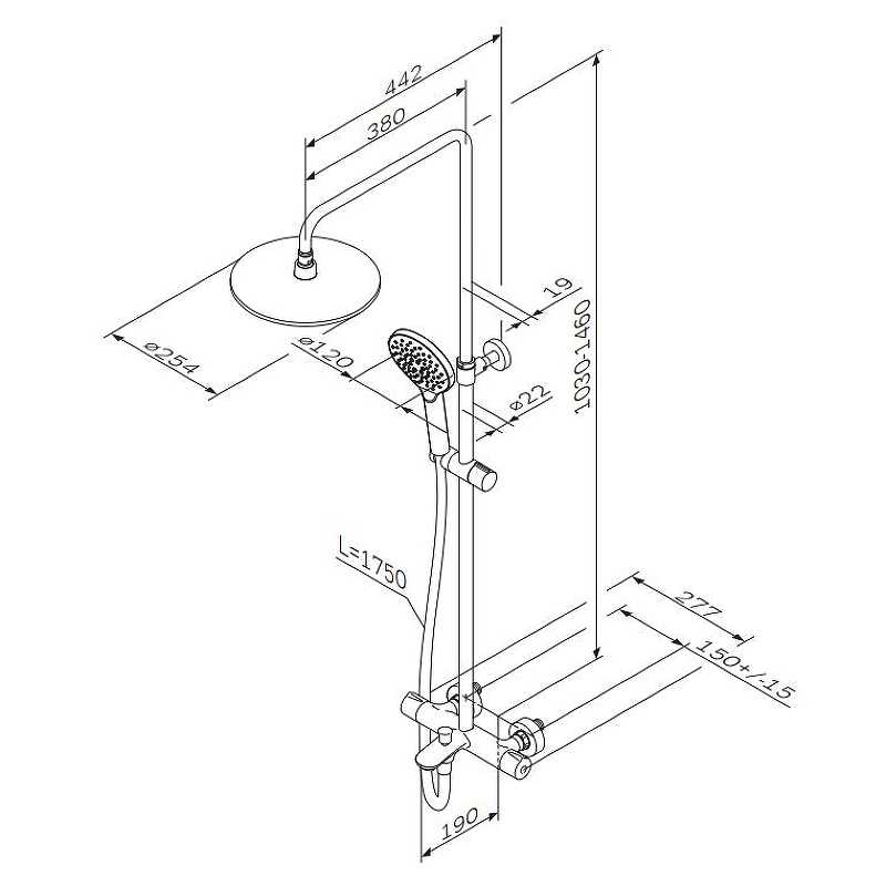 Держатель ручного душа: на штанге, регулируемый в трех плоскостях.