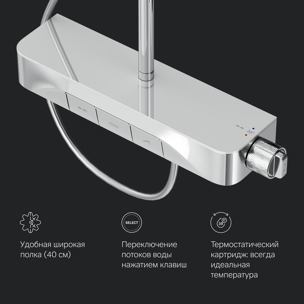 Интуитивно понятное управление: всего одна удобная ручка для настройки температуры и потока воды. Ручка дополнена инновационным антискользящим покрытием которое позволяет комфортно управлять душевой системой даже с мыльными руками. Переключение потоков воды осуществляется нажатием клавиши.