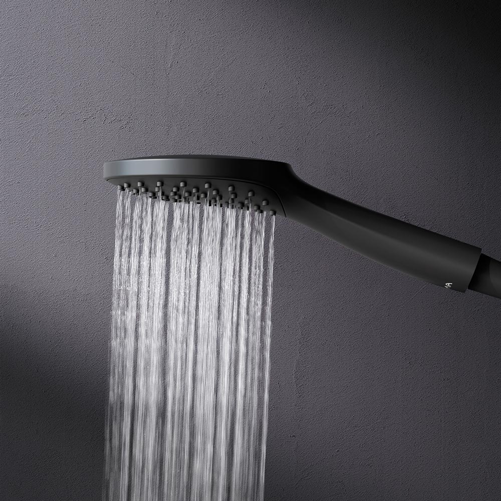 Черный цвет как нельзя лучше подчеркивает изящество силуэтов смесителя и душевой системы добавляя роскошь интерьеру ванной комнаты.