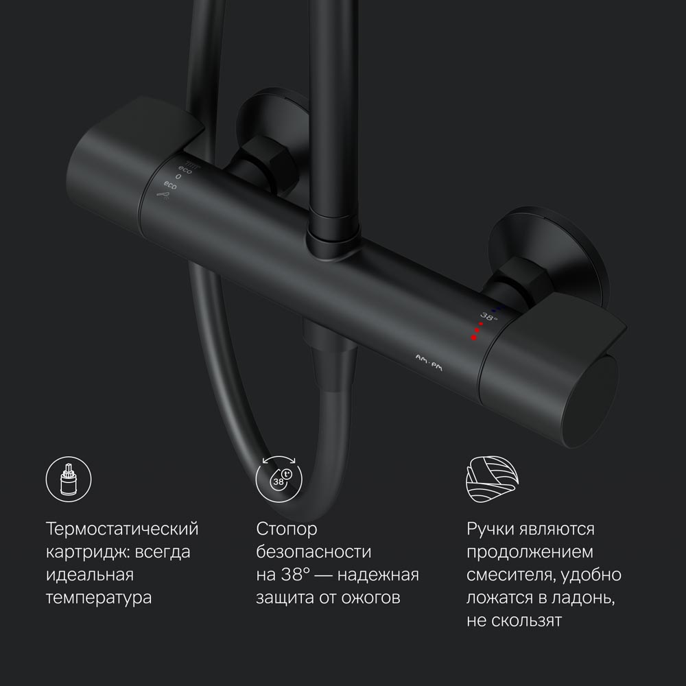 Благодаря специально спроектированной эргономичной ручке вы можете управлять душевой системой даже с мыльными руками. Термостатический картридж с высокочувствительным термоэлементом и быстрой реакцией на изменения температуры или давления надежно защищает от ожога даже при внезапном отключении холодной воды.