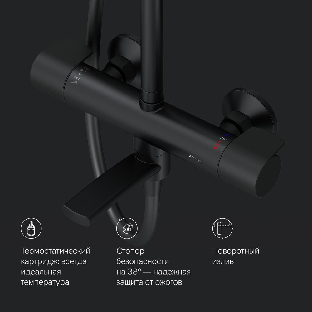 Благодаря специально спроектированной эргономичной ручке вы можете управлять душевой системой даже с мыльными руками. Термостатический картридж с высокочувствительным термоэлементом и быстрой реакцией на изменения температуры или давления надежно защищает от ожога даже при внезапном отключении холодной воды.