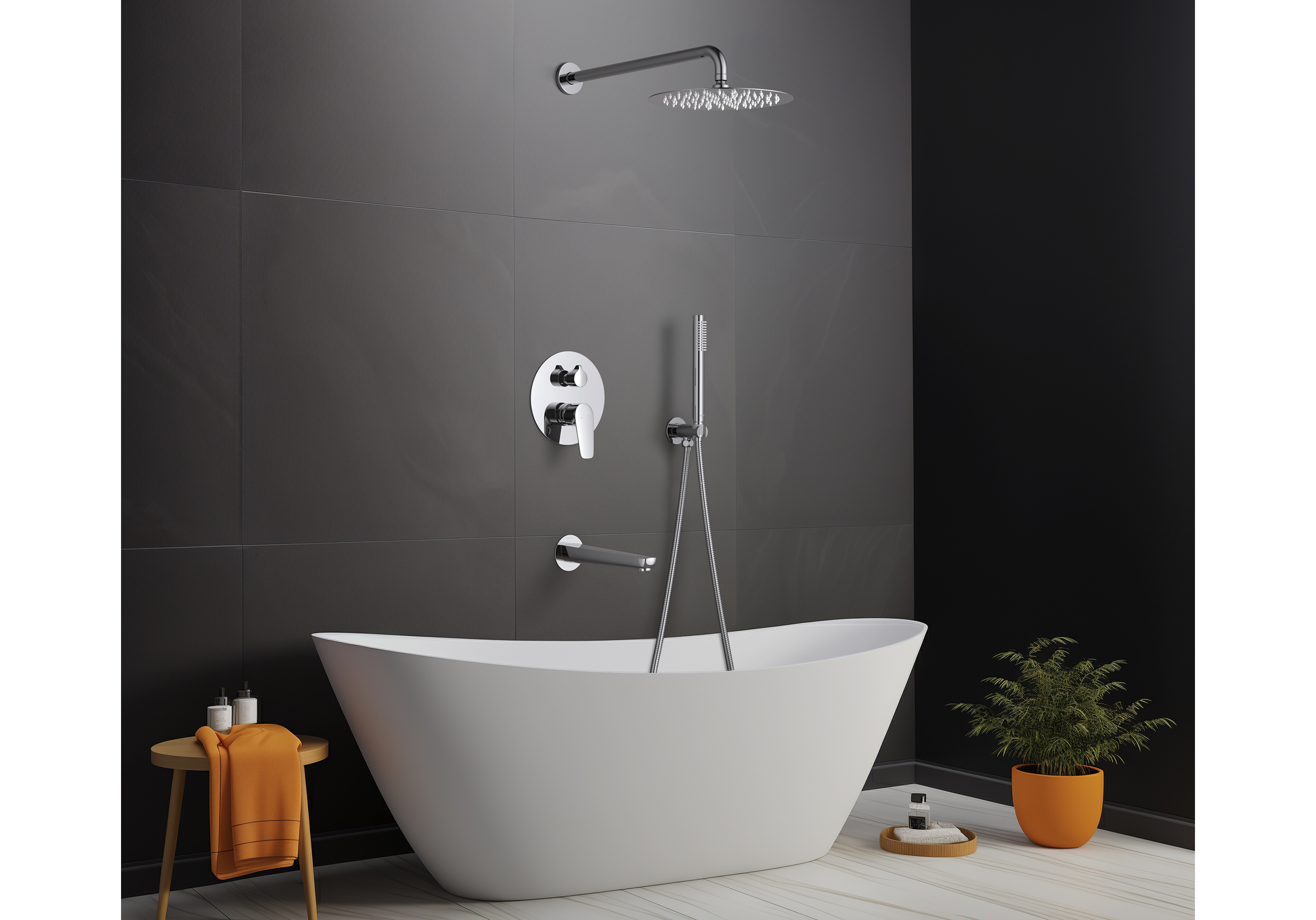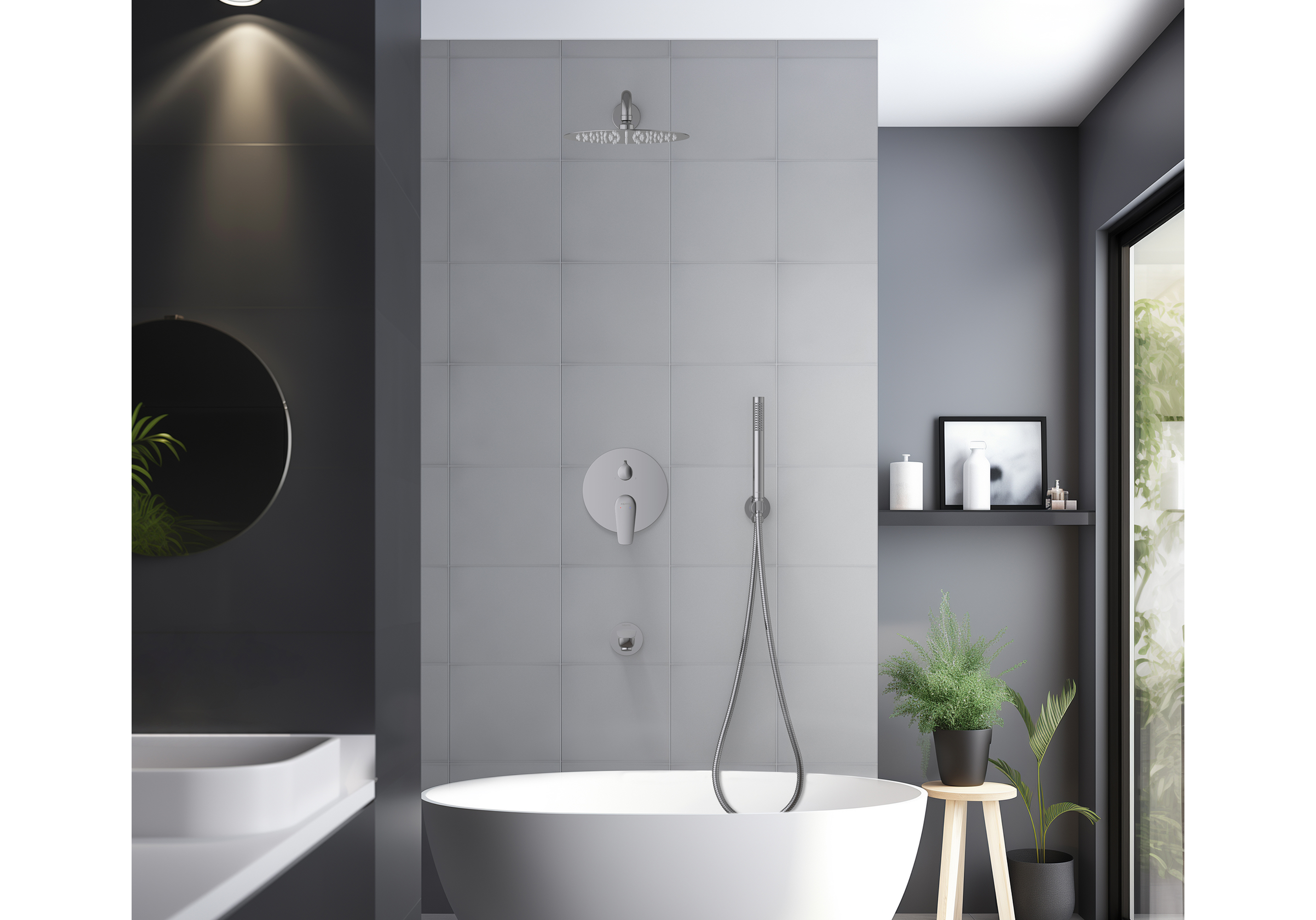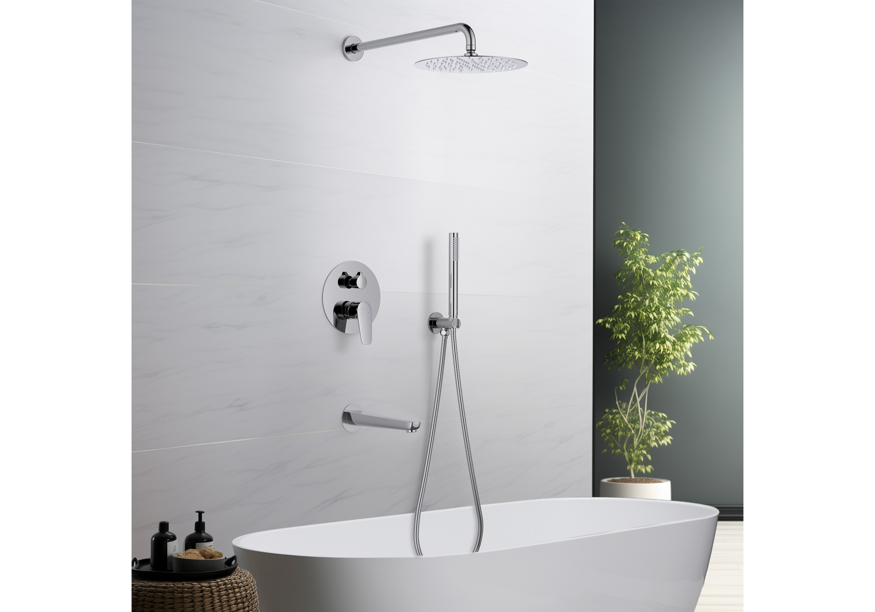 смеситель из латуни на 3 потребителя, картридж citec 35 мм, испания, декоративная пластина 3мм из нерж., кронштейн для верхнего душа 400мм из нерж., верхний душ 250х2мм из нерж., душевой шланг 1,5м из нерж., латунный держатель ручного душа, ручной душ из латуни на 1 режим струи, излив длиной 220мм из латуни, упакован в коробку, пленку из вспененного пвх