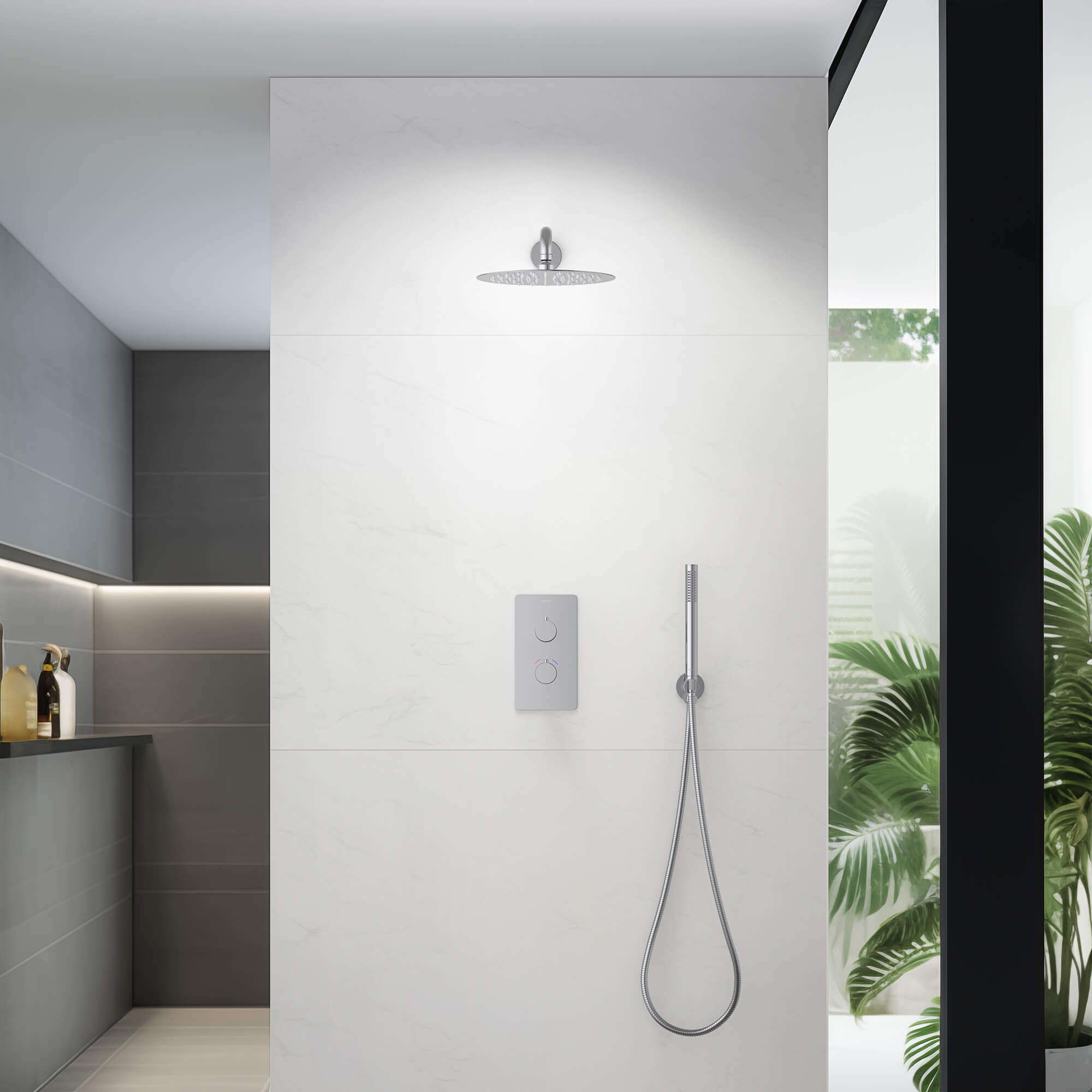 смеситель термостатический из латуни на 2 потребителя, картридж vernet, франция, декоративная пластина 3мм из нерж., кронштейн для верхнего душа 400мм из нерж., верхний душ 250х2мм из нерж., душевой шланг 1,5м из нерж., ручной душ из латуни на 1 режим струи, латунное шланговое соединение с держателем, упакован в коробку, пленку из вспененного пвх