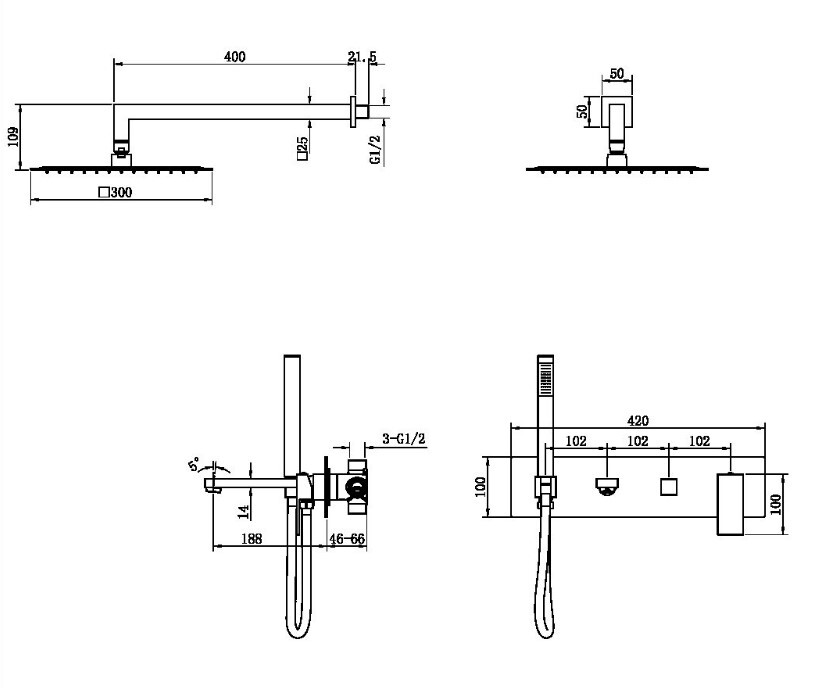 Состав поставки: смеситель, верхний душ, ручная лейка, душевой шланг, держатель, излив