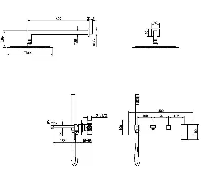 Состав поставки: смеситель, верхний душ, ручная лейка, душевой шланг, держатель, излив