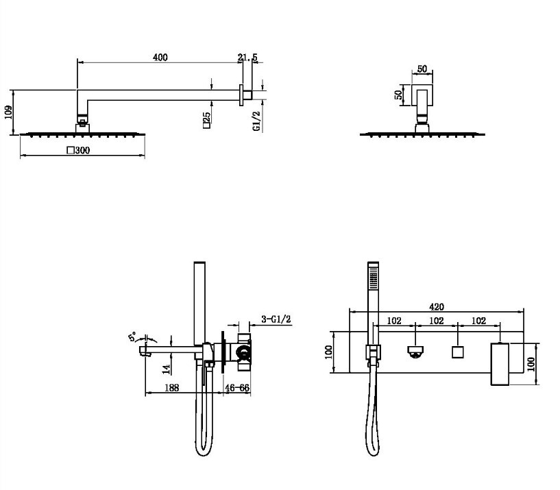 Состав поставки: смеситель, верхний душ, ручная лейка, душевой шланг, держатель, излив