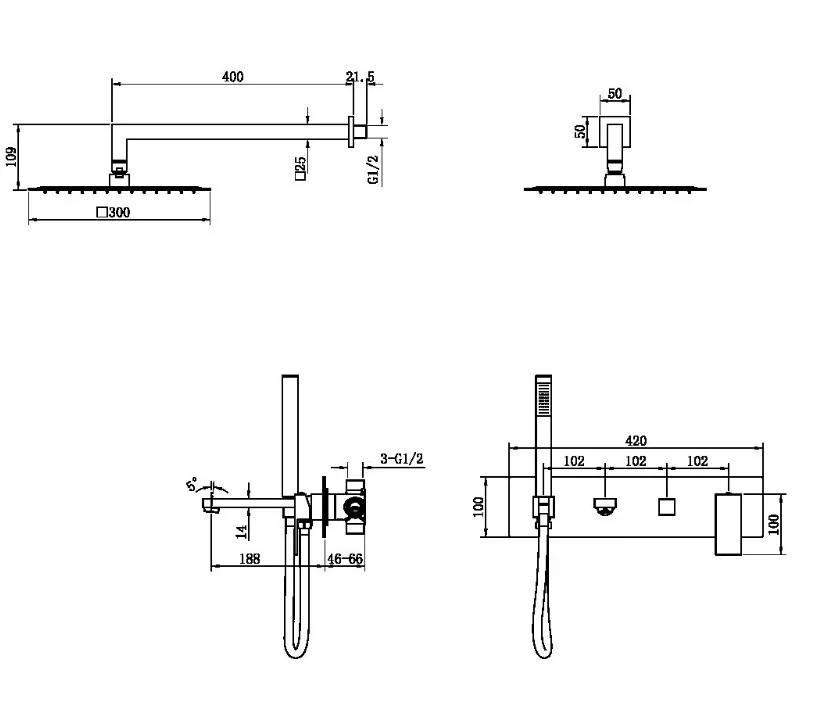Состав поставки: смеситель, верхний душ, ручная лейка, душевой шланг, держатель, излив