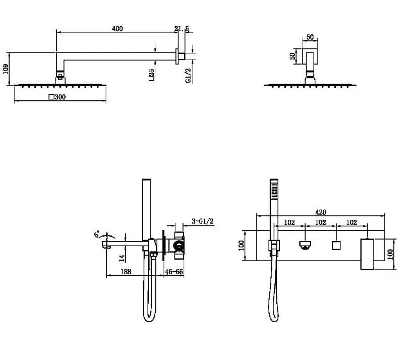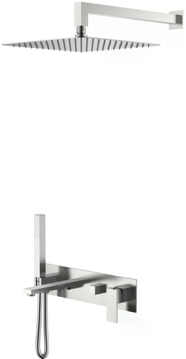 Состав поставки: смеситель, верхний душ, ручная лейка, душевой шланг, держатель, излив