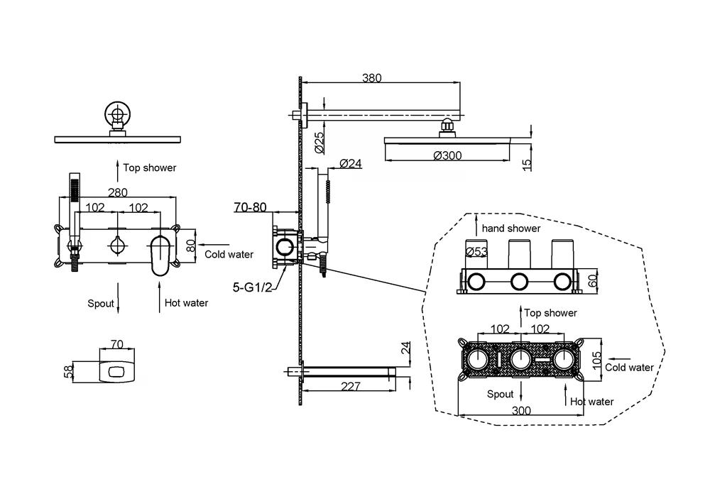 Состав поставки: смеситель, верхний душ, ручная лейка, душевой шланг, держатель, излив