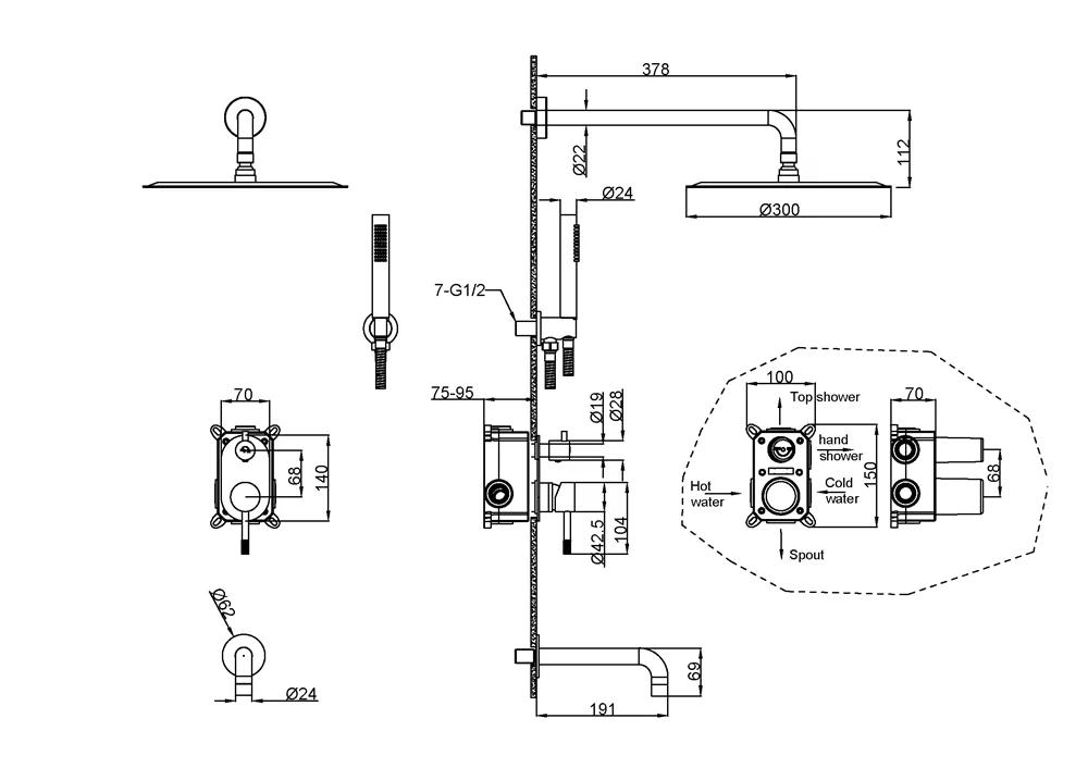 Состав поставки: смеситель, верхний душ, ручная лейка, душевой шланг, держатель, излив