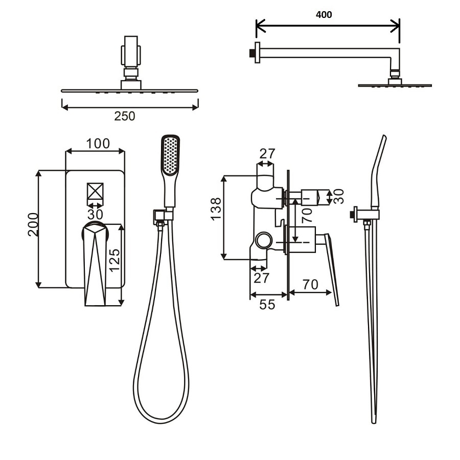 Состав поставки: смеситель, верхний душ, ручной душ, душевой шланг