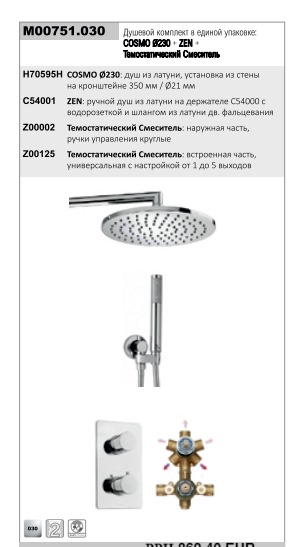 Душевая система Bossini Cosmo термостат, верхний душ 230 мм ручной душ ZEN, шланг 150 см хром (M00751.030)