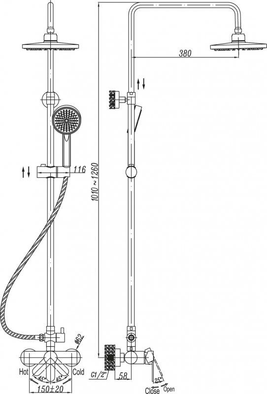 Состав поставки: смеситель, душевой шланг, душевая лейка , держатель для душа, верхний душ 20 см