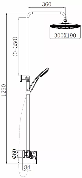 В комплект поставки входит: смеситель, шланг, держатель, лейка, стойка, верхний душ, излив