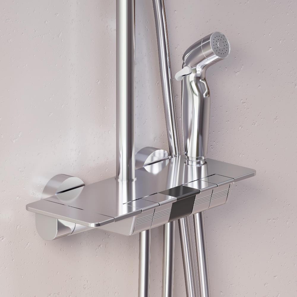 Максимальная безопасность и технологичность: термостатический картридж 35 мм обеспечивает точную настройку температуры и напора воды. Душевая система оснащена автоматическим дисплеем отражающим температуру воды в реальном времени. Непревзойдённый комфорт и удобство: тонкий латунный корпус выполнен в виде компактной полочки где вы можете хранить все необходимые вещи. Благодаря телескопической штанге с диапазоном регулировки в 400 мм водные процедуры будут одинаково комфортны абсолютно для всех членов семьи.
