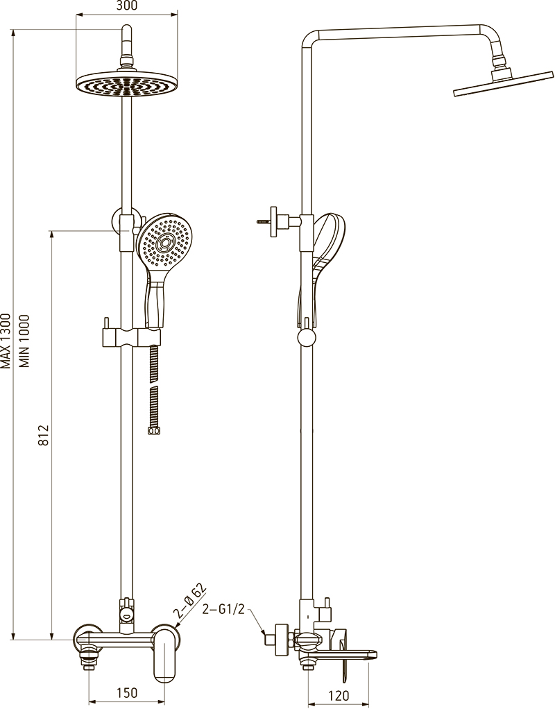 Выдвижная телескопическая стойка (нерж. сталь, хром): высота функциональная 1000 -1400 мм, диаметр 25 мм, вылет верхнего душа 320 мм, держатель ручной лейки плавающий FightFix