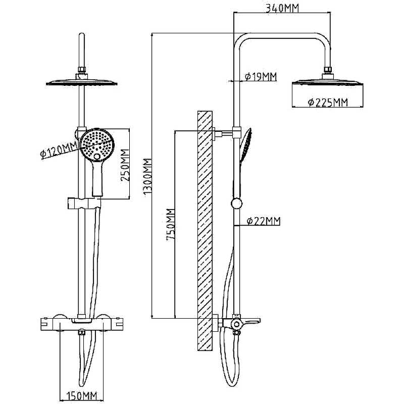 Выдвижная телескопическая стойка (нерж. сталь, хром): высота функциональная 750 -1300 мм, диаметр 22 мм, вылет верхнего душа 340 мм, держатель лейки плавающий FightFix