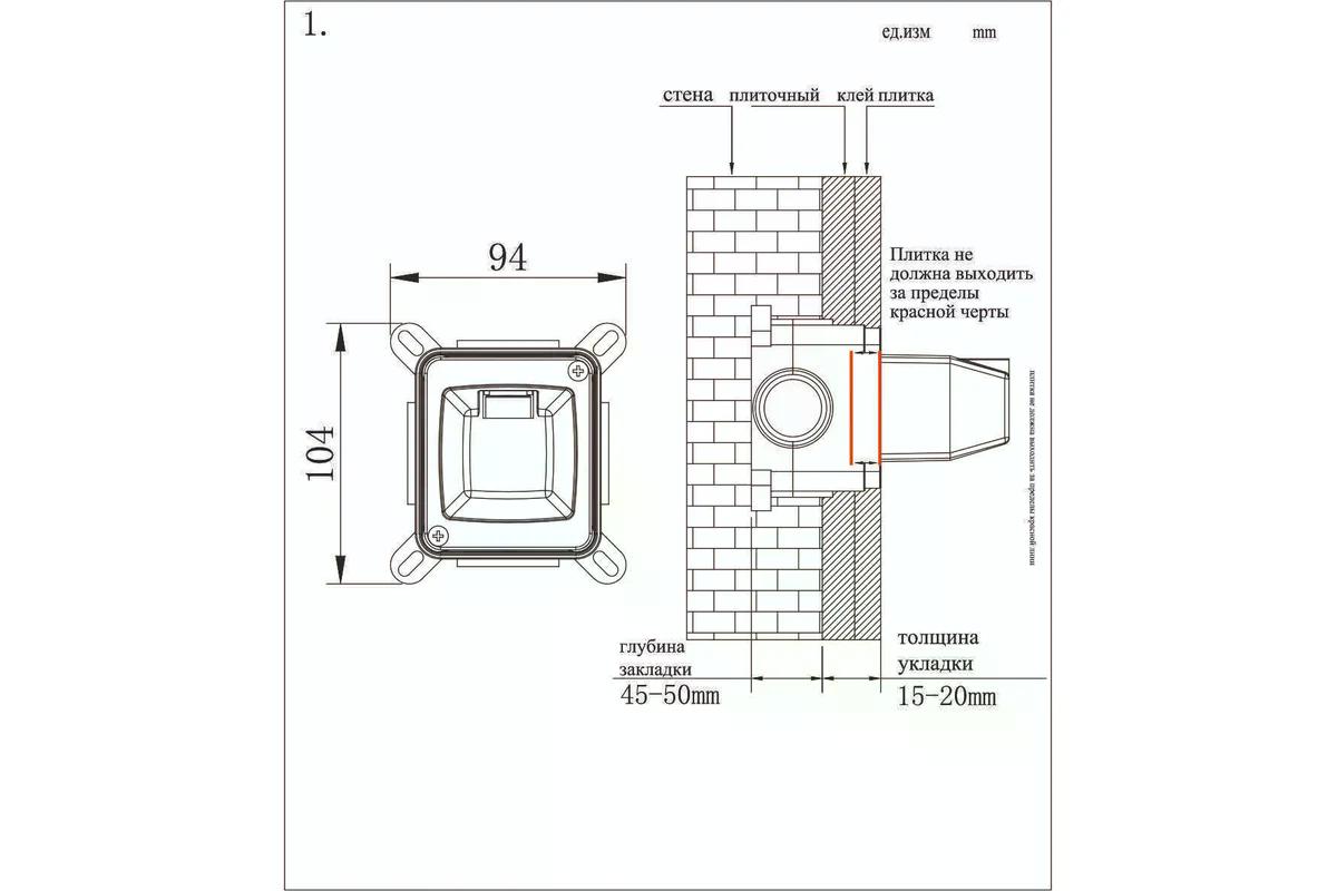 внутренняя часть: 104х94 мм, вход 1/2"", выход на душ 1/2""