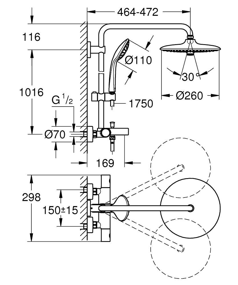 Душевой кронштейн с шаровым шарниром угол поворота ± 15°