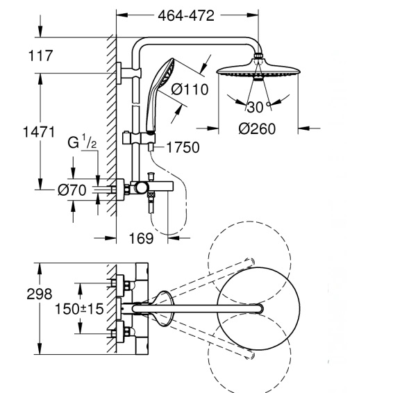 Поворотный горизонтальный кронштейн с лейкой тропического душа позволит установить устройство в нужном положении.