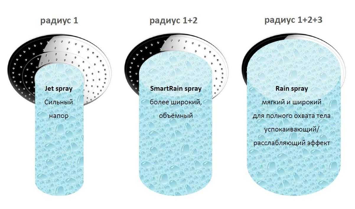 Благодаря трем режимам тропического душа – «дождь», «дождь с экономным расходом воды» и «интенсивная круговая струя» – вы без труда найдете свой идеальный душ.
