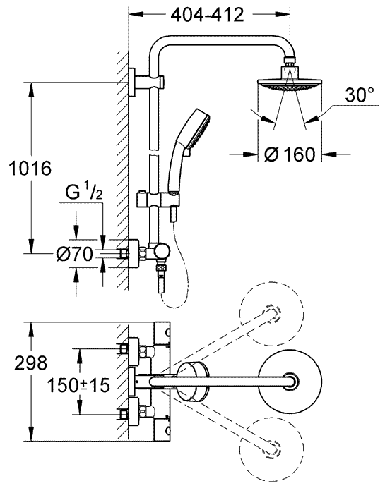 Она состоит из термостата с аквадиммером, верхнего душа и ручной лейки (размер лейки: 10 см,