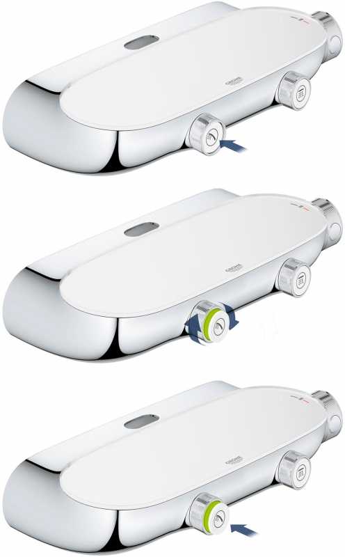 - Диск верхнего душа снимается: его можно мыть в посудомоечной машине. «Умные» кнопки SmartControl на термостате полностью отвечают за контроль над напором и температурой воды. Фирменная технология GROHE TurboStat® быстро реагирует на изменения давления в системе, обеспечивая стабильную подачу воды заданной температуры. Кроме того, стопор безопасности сработает при достижении температуры 38 °C, что исключает возможность внезапного ошпаривания при принятии водных процедур.