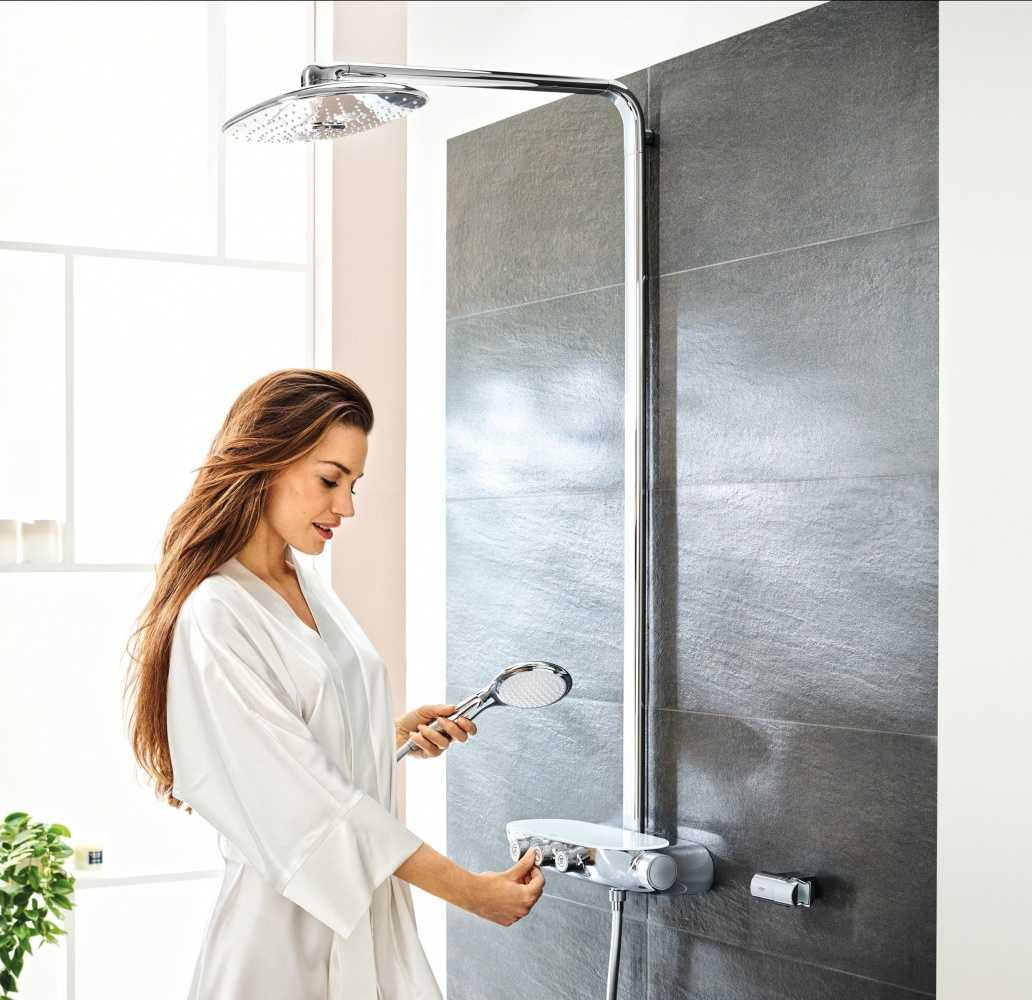 Полноценная душевая система от немецкого бренда Grohe включает в себя верхний душ, ручной душ и смеситель-термостат.
