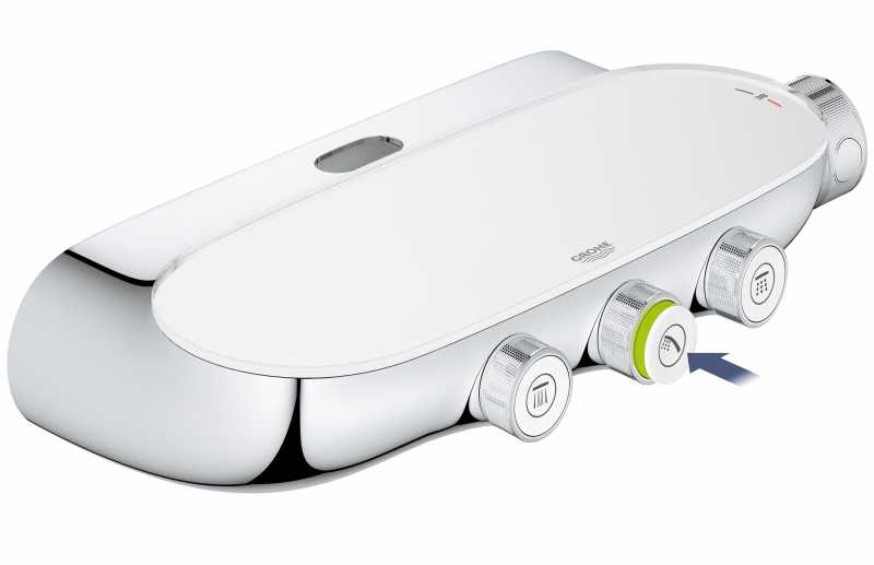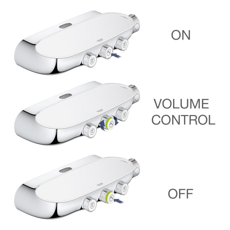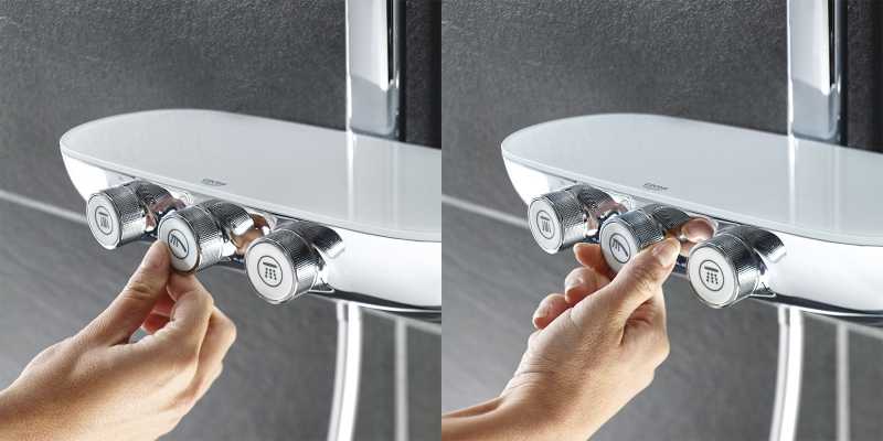 Поддержку постоянной температуры воды обеспечивает фирменная система GROHE TurboStat, стопор безопасности срабатывает при повышении температуры воды до 38 °C.