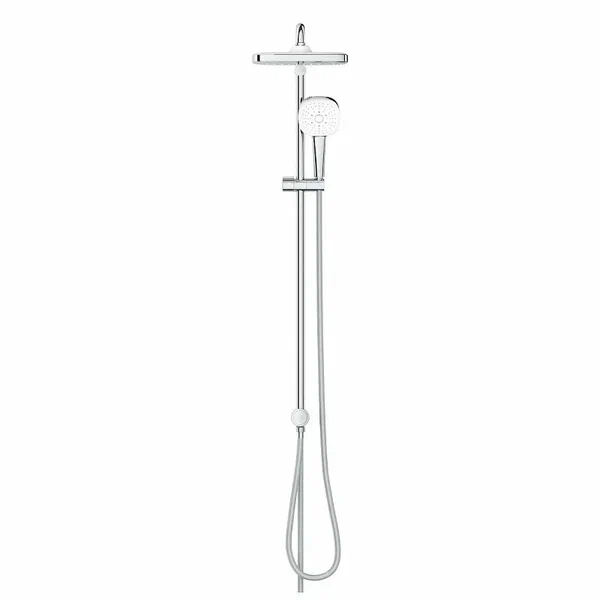 В комплекте: душевая стойка, верхний душ, лейка душевая, душевой шланг
