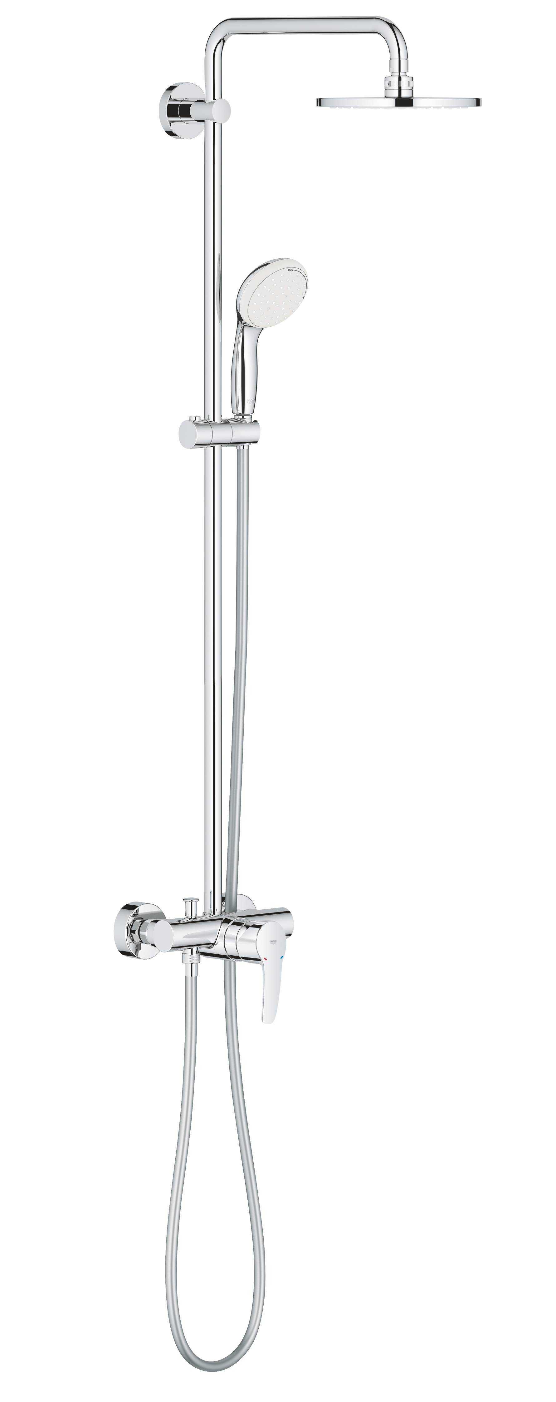 Душевая система с однорычажным смесителем настенного монтажа включает в себя:горизонтальный поворотный душевой кронштейн 450 ммоднорычажный смеситель для душа с переключателемверхний душ Tempesta Cosmopolitan 200 (27 541)душевая струя Rain, с шаровым шарниром, угол поворота ± 15°ручной душ Tempesta 100, 2 вида струй: Rain, Jet. 9,5 л/мин (27 597)регулируется по высоте с помощьюскользящего элементадушевой шланг, 1.750 мм 1/2" x 1/2" (28 410)GROHE SilkMove керамический картридж 46 ммGROHE DreamSpray превосходный поток водыGROHE StarLight хромированная поверхностьс системой SpeedClean против известковых отложенийВнутренний охлаждающий канал для продолжительного срока службыTwistfree против перекручивания шлангасовместим с проточным водонагревателем от 18 kВ/чминимальный расход воды 7л/минминимальное давление 1,0 бар