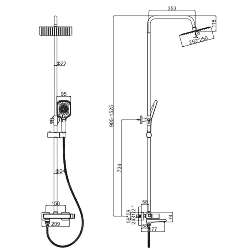 Состав поставки: смеситель, душевая стойка, верхний душ, душевая лейка, душевой шланг, держатель для душевой лейки, настенный держатель, отражатели, эксцентрики