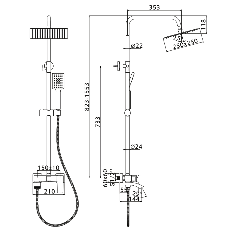 Состав поставки: смеситель, душевая стойка, верхний душ, душевая лейка, душевой шланг, держатель для душевой лейки, настенный держатель, отражатели, эксцентрики