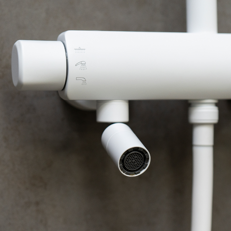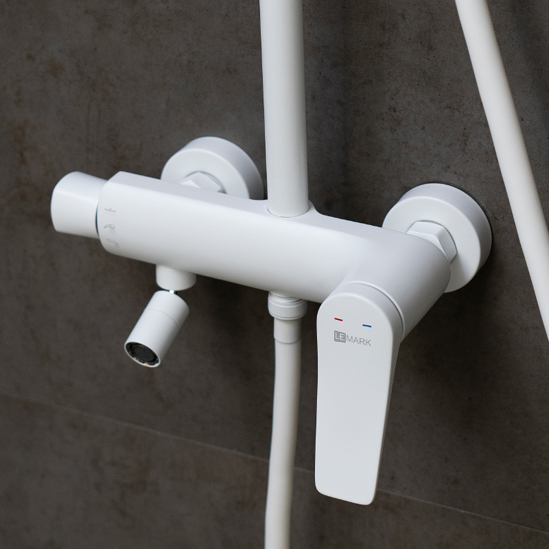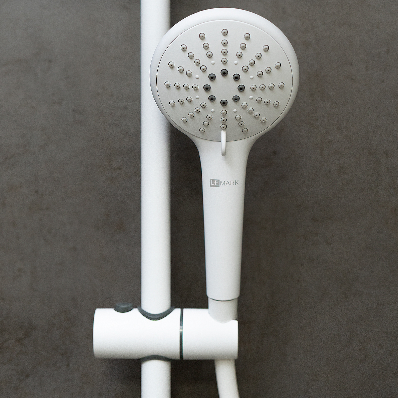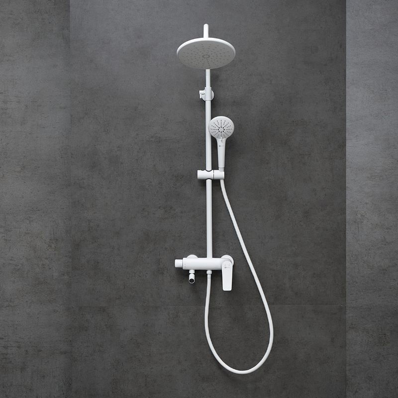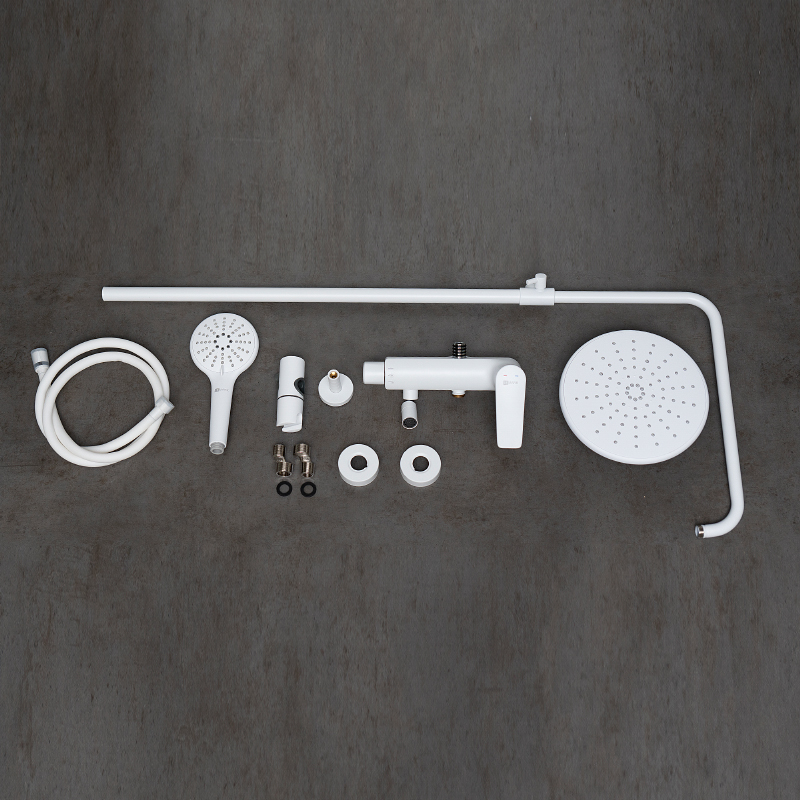 Состав поставки: смеситель, душевая стойка, верхний душ, душевая лейка, душевой шланг, держатель для душевой лейки, настенный держатель, отражатели, эксцентрики