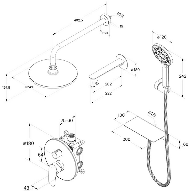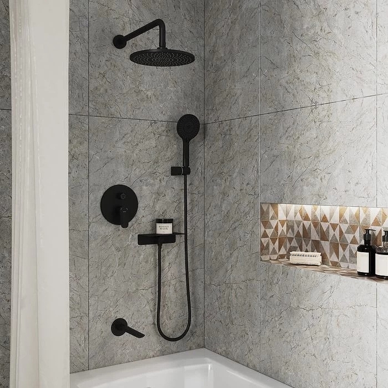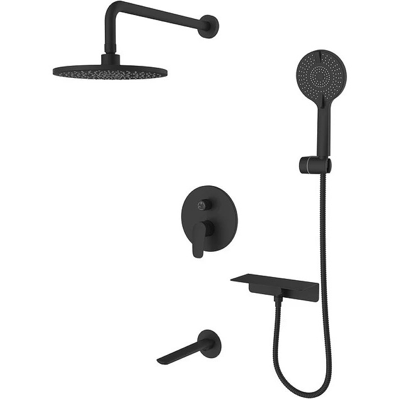 Состав набора: смеситель скрытого монтажа с 3 выходами с внутренней частью, функциональный бокс, верхняя лейка, диаметр 250 мм, кронштейн из нержавеющей стали, длина 390 мм, стальной излив 203 мм, ручная лейка на 4 режима, диаметр 120 мм, выход для шланга с полкой, держатель для лейки, шланг 150 см. Цвет: черный матовый