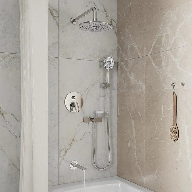 Состав набора: смеситель скрытого монтажа с 3 выходами с внутренней частью, функциональный бокс, верхняя лейка, диаметр 250 мм, кронштейн из нержавеющей стали, длина 390 мм, стальной излив 203 мм, ручная лейка на 4 режима, диаметр 120 мм, выход для шланга с полкой, держатель для лейки, шланг 150 см. Цвет: глянцевый хром