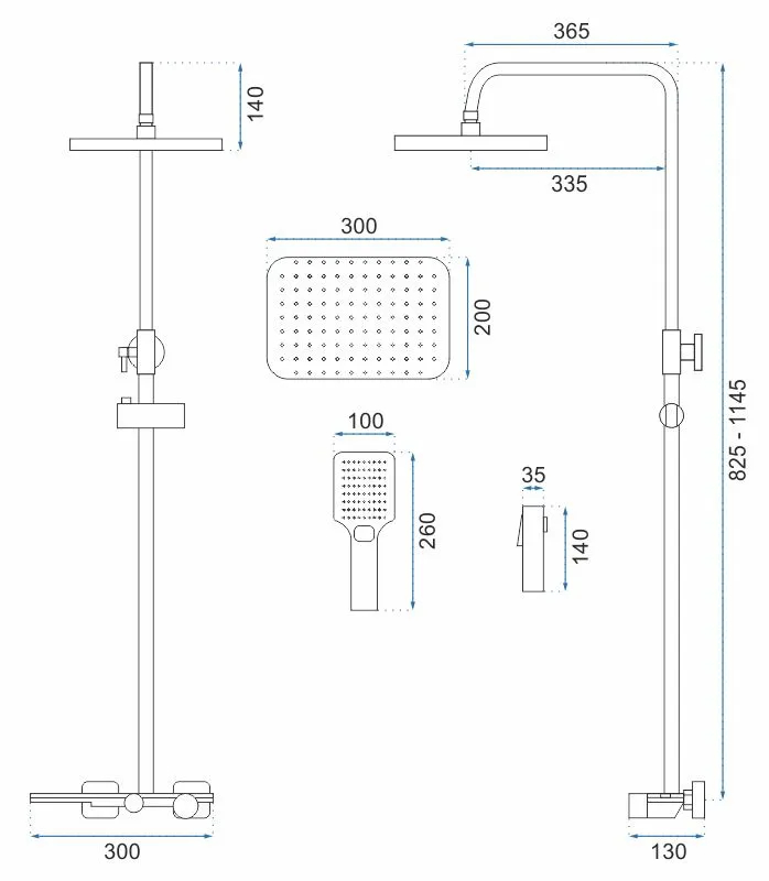 Комплектация: металлическая розетка, эксцентрики, душевой шланг, душевая лейка, держатель для душевой лейки, верхний душ, кронштейн, душевая штанга.