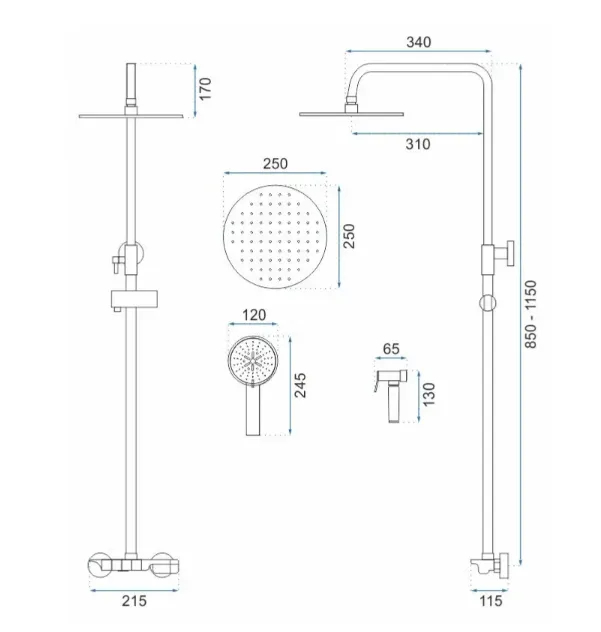 Комплектация: металлическая розетка, эксцентрики, душевой шланг, душевая лейка, держатель для душевой лейки, верхний душ, кронштейн, душевая штанга.