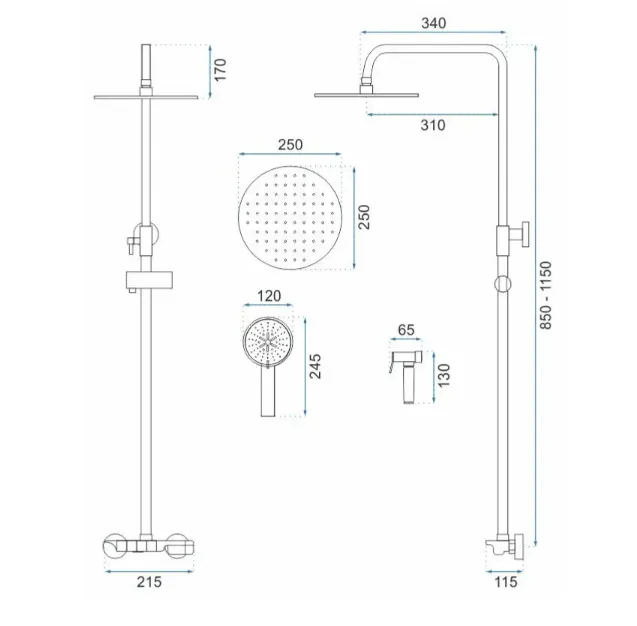 Комплектация: металлическая розетка, эксцентрики, душевой шланг, душевая лейка, держатель для душевой лейки, верхний душ, кронштейн, душевая штанга.