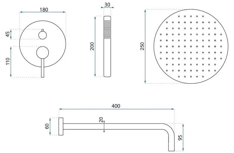 Комплектация: душевой шланг, душевая лейка, подключение для душевого шланга с держателем, верхний душ, скрытая монтажная часть, смеситель, кронштейн
