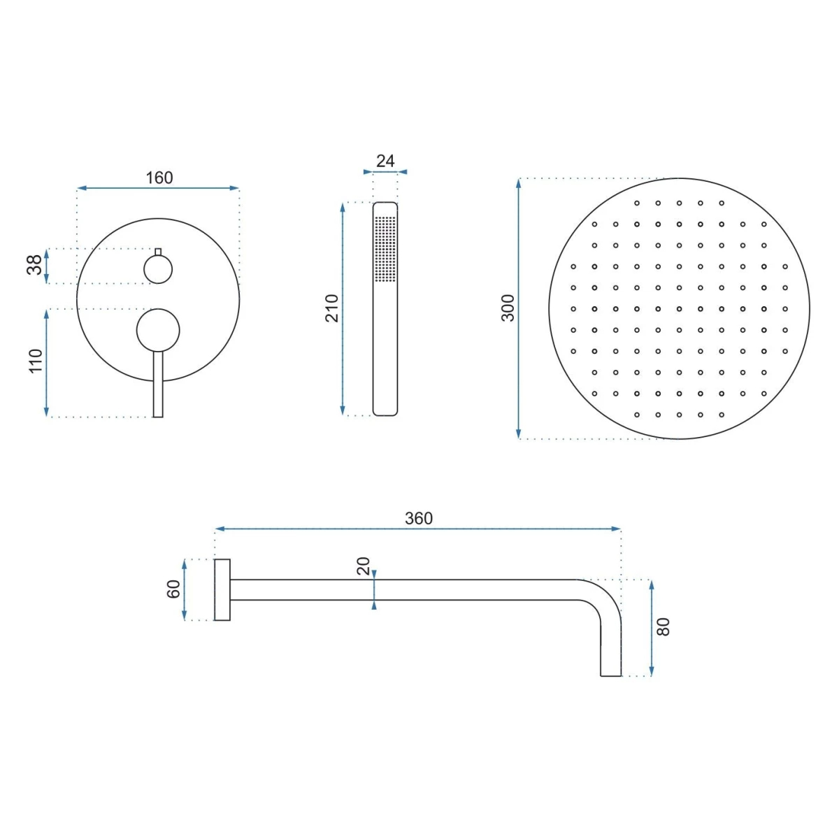 Комплектация: смеситель, душевой шланг, душевая лейка, держатель для душевой лейки, верхний душ.
