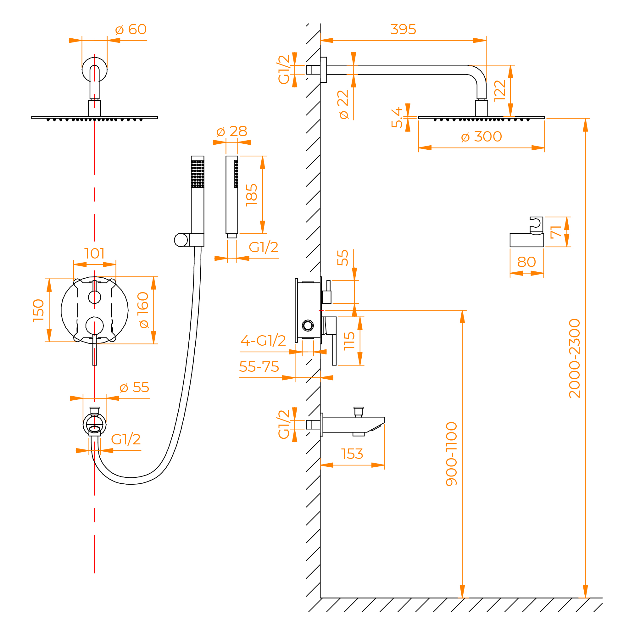 Головной душ, горизонтальный держатель из нержавеющей стали. Головной душ оснащён шарнирным креплением, что позволяет выбрать необходимый угол направления воды