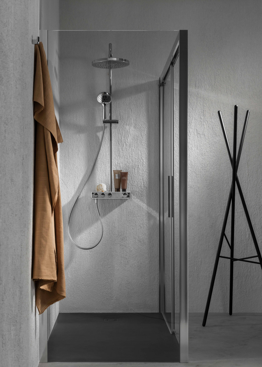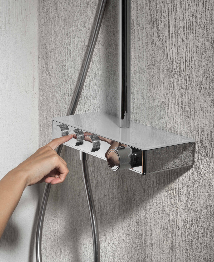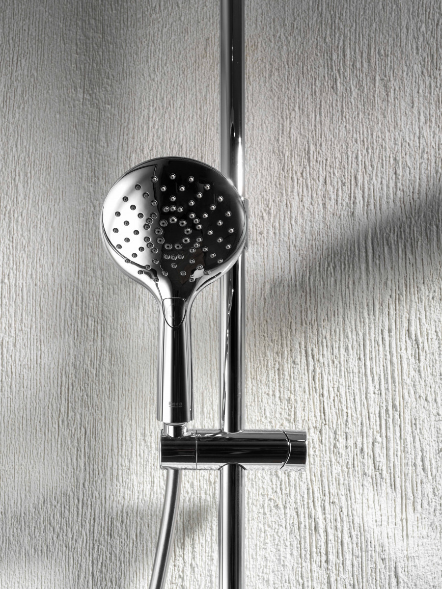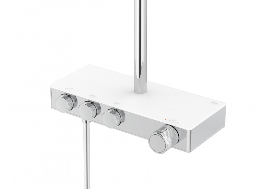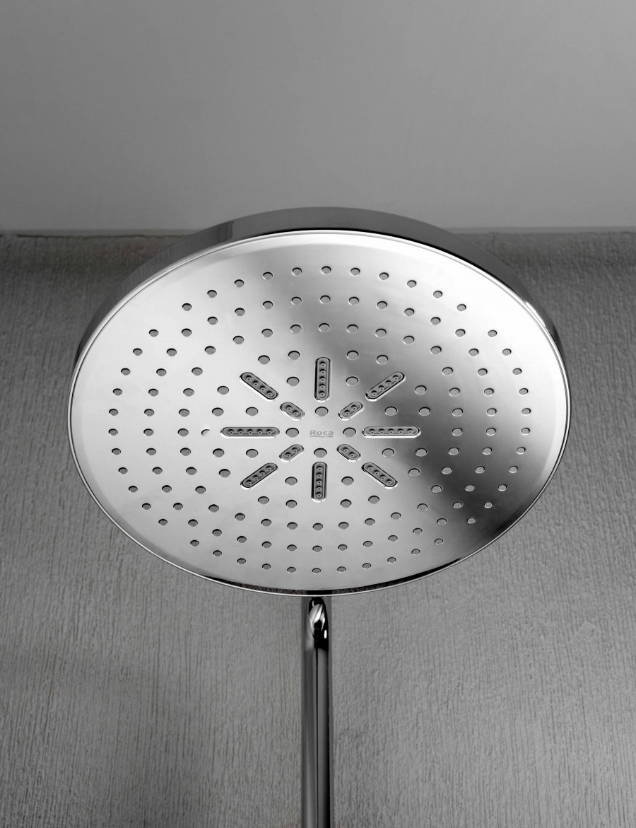 Roca Index-T - Термостатическая душевая система на 3 выхода, с нажимными переключателями с регулировкой потока, хром. Index-T обеспечивает постоянную температуру вне зависимости от перепадов давления в системе водопровода. Даже когда ваши близкие смывают воду в туалете или занимаются стиркой пока вы принимаете душ, вы не пострадаете от неприятных холодовых потрясений или ожогов. Термостатический картридж от лидера в этой области – компании Vernet (Франция). Термостатическая душевая система INDEX-T предлагает стабильное управление термостатом и легкое включение/выключение с помощью удобных нажимных кнопок с поворотным механизмом для регулировки потока воды для ежедневного использования. Изумительный дизайн идеально подойдет вашей ванной комнате. Пластиковый корпус защищает пользователя от прикосновения к нагретым частям внутри смесителя. Полочка из закаленного стекла поможет разместить душевые принадлежности на смесителе. Верхний душ с увеличенным диаметром 300 мм имеет два режима - режим дождя и пульсирующий режим. Режим дождя с широким покрытием делает душ более мягким, без чувства покалывания, с ощущением полного погружения в теплый и влажный душ. Он следует тенденциям здоровья, успокаивает, переводя вас из возбужденного состояния в более расслабленное. За счет более мелких форсунок, сила распыления мягче, чем у обычного распылителя. Пульсирующий режим с высокой частотой и мощностью быстро восстанавливает и снимает мышечное напряжение после сложного дня или тренировки. Массажная струя воздействует на акупунктурные точки, снижает стресс, расслабляет и помогает заснуть.