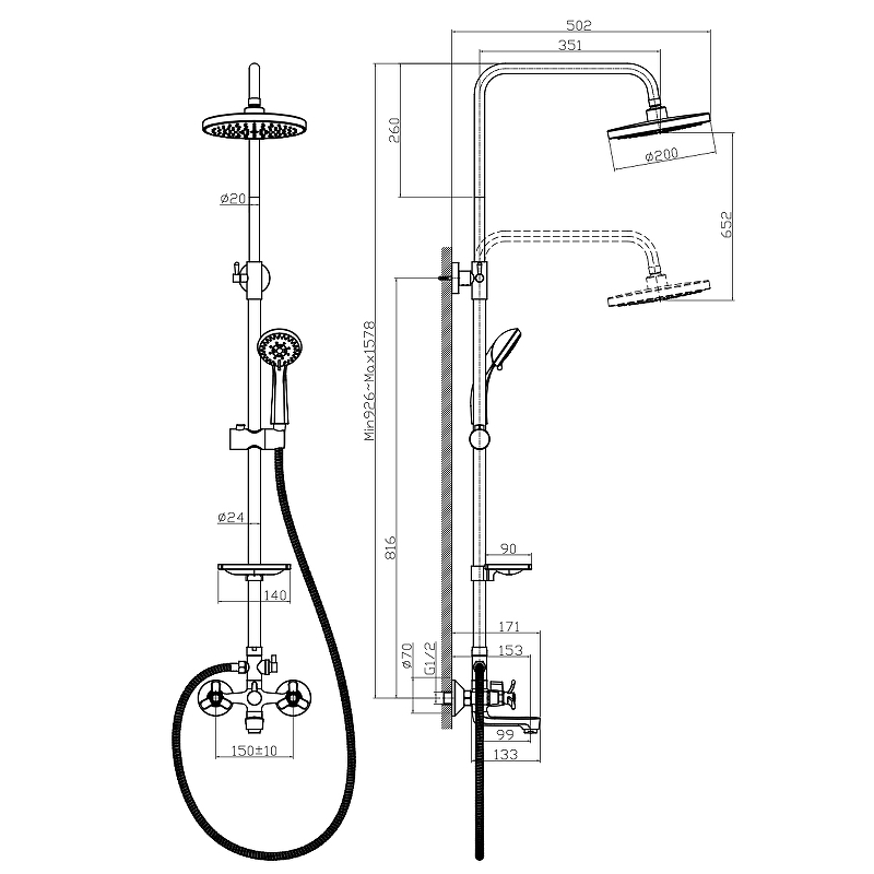 Душевая система с верхним душем 20 см и изливом 10 см, регулируемая высота 0,9~1,6 м, латунь/хром