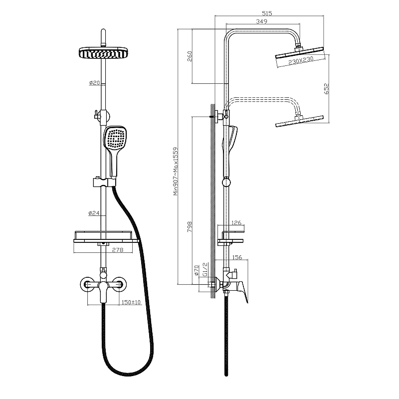 Душевая система с верхним душем 23х23 см, регулируемая высота 0,9~1,6м, латунь/хром