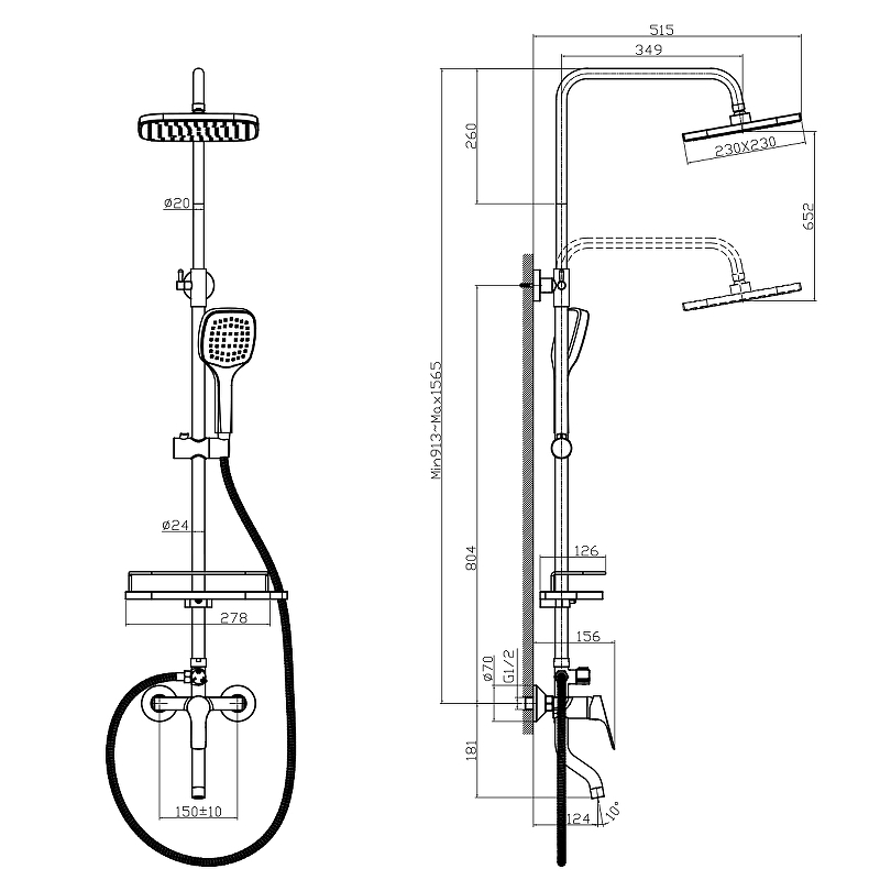 Душевая система с верхним душем 23х23 см и поворотным изливом 7 см, регулируемая высота 0,9~1,6м, латунь/хром