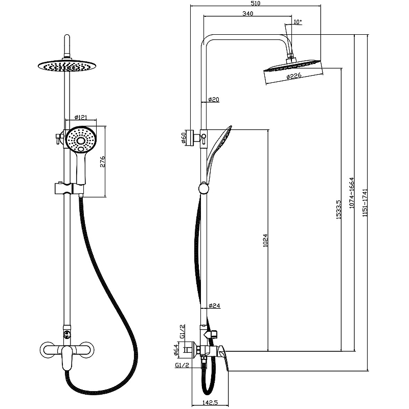 Душевая система с верхним душем 22,6 см, регулируемая высота 1~1,6м, латунь/хром