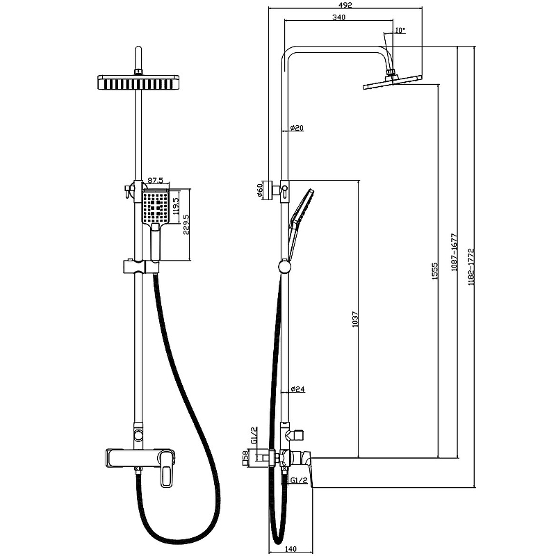 Душевая система с верхним душем 26х19 см, регулируемая высота 1~1,68м, латунь/хром