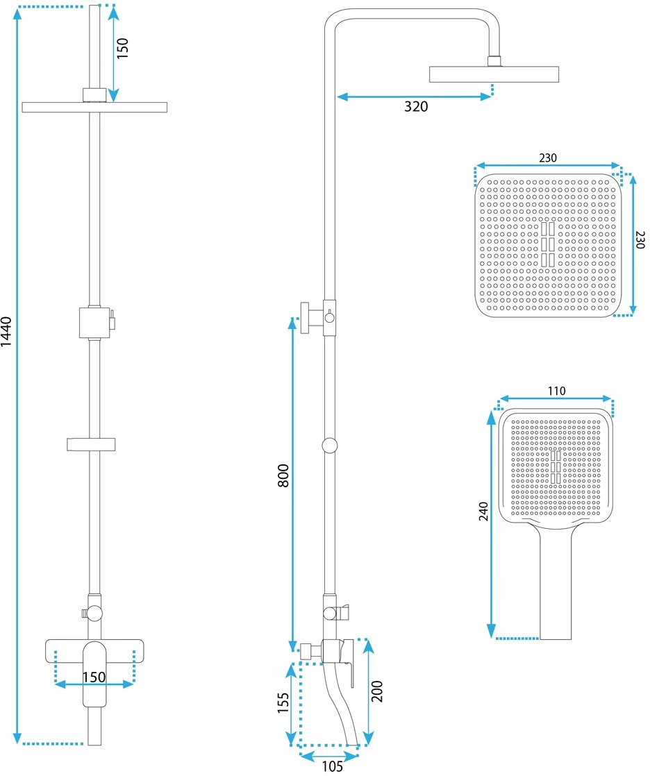 Комплектация: металлическая розетка, эксцентрики, душевой шланг, душевая лейка, держатель для душевой лейки, верхний душ, кронштейн, душевая штанга.