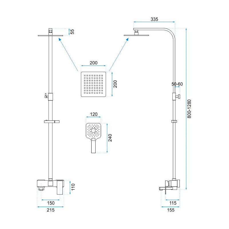 Монтаж: настенный. Верхний душ: 200*200 мм. Форма: квадратная. Управление: однорычажное. Дивертор: керамический. Регулировка по высоте: да.
